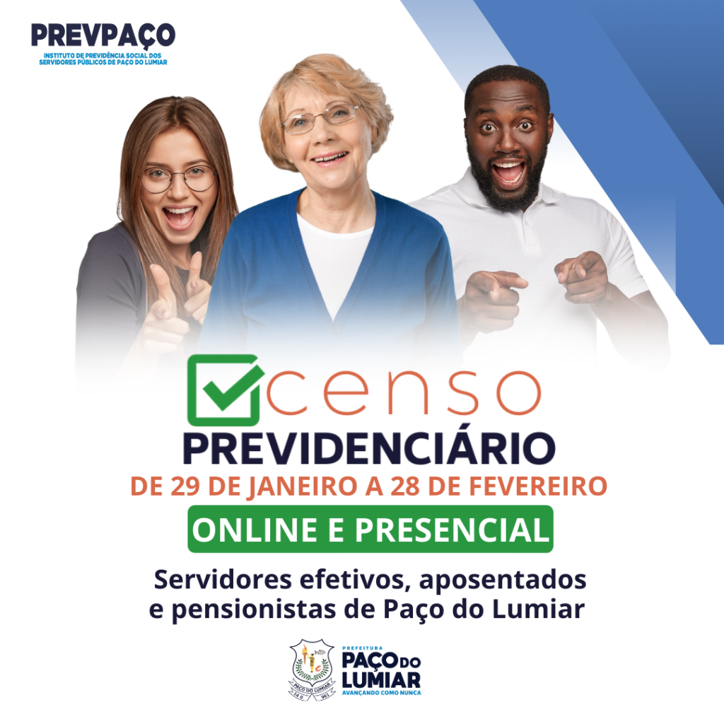 A Prefeitura de Paço do Lumiar, através do Instituto de Previdência Social do Município de Paço do Lumiar – PREVPAÇO, informa a partir de 29 de janeiro de 2024, terá início o Censo Cadastral Funcional e Previdenciário, OBRIGATÓRIO para servidores efetivos, aposentados, e respectivos dependentes, e pensionistas. O Censo se estenderá até o dia 28 de fevereiro de 2024 e tem a finalidade de obter e consolidar dados atualizados e consistentes para base do Cálculo Atuarial, viabilizando assim projeções atuais e futuras indispensáveis ao equilíbrio financeiro do Regime Próprio de Previdência Social – RPPS e organizar e revisar o Plano de Custeio e de Benefícios Previdenciários.
